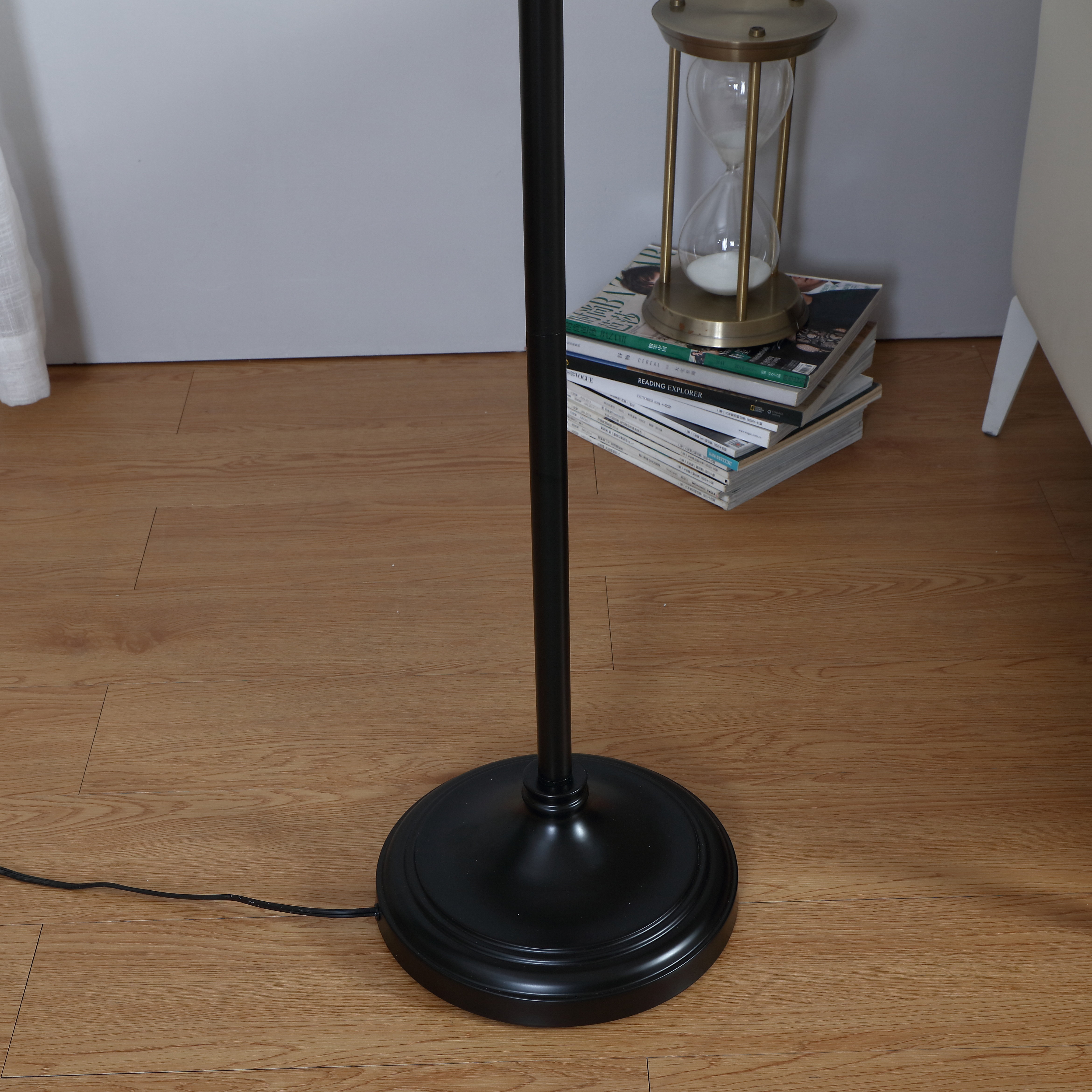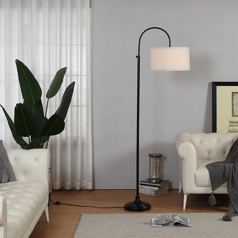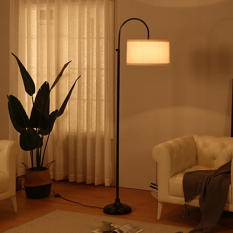 This is a great lamp to stand up over the living or family room sectional. The 1.5inch high base slides easily under your couch. With a white fabric lampshade, this lamp cast a warm, soft light to bright your living room,office and protect your eyes while you are reading or working.This lamp add elegance to your home or office with its neutral linen lamp shade that complements the pole and sturdy black base. Enjoy overhead light for reading, knitting, and other hobbies.