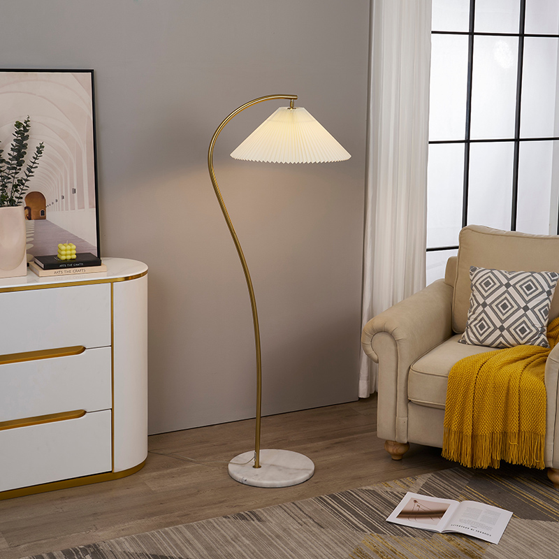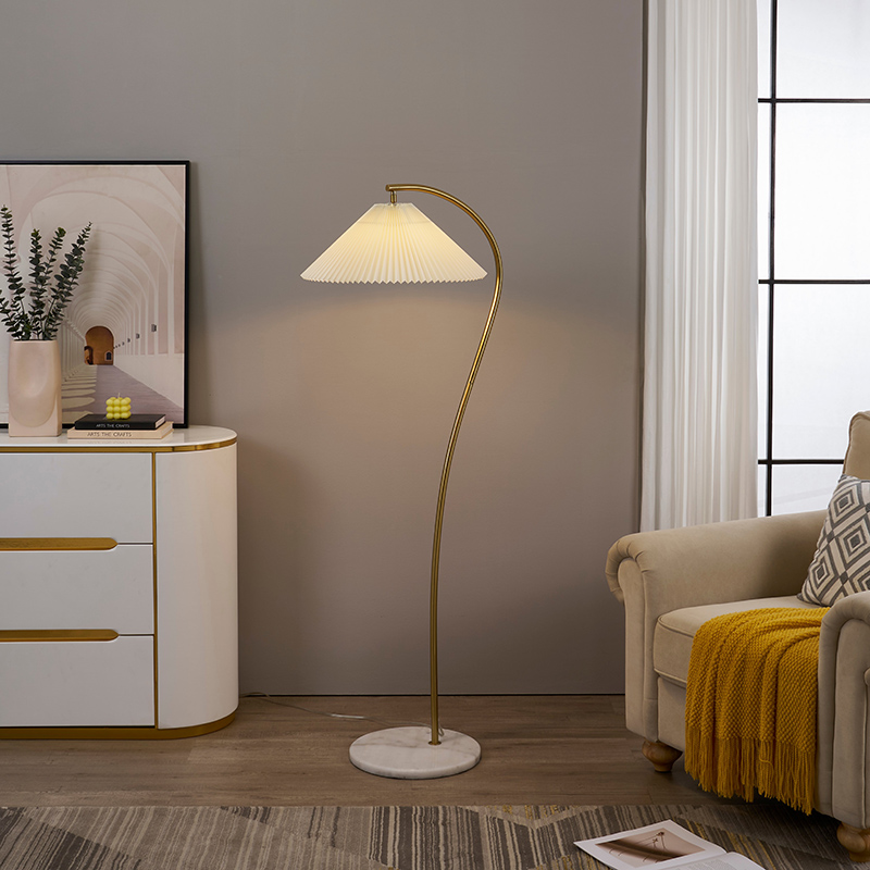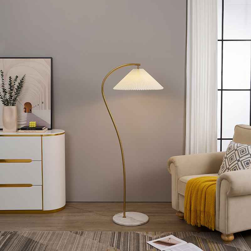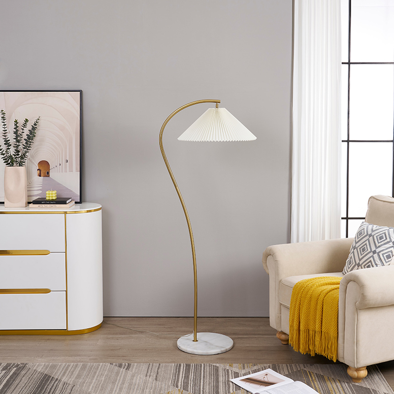Modern Pleated Lampshade Floor Lamp with Natural Marble Base & Curved Brass Body
